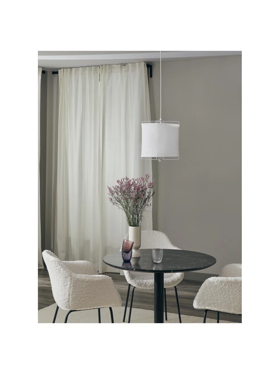 Die Pendelleuchte mit dem klangvollen Namen „Clouds“ lässt uns gedanklich ans Mittelmeer reisen. Mit ihrem modernen Design-Mix aus Skandi und Boho, dem natürlichen Leinenstoff und der gedeckten Farbwelt bringt sie den Look mallorquinischer Fincas in unser Zuhause. Licht an! So wird auch die feine Leinenstruktur sichtbar…